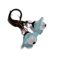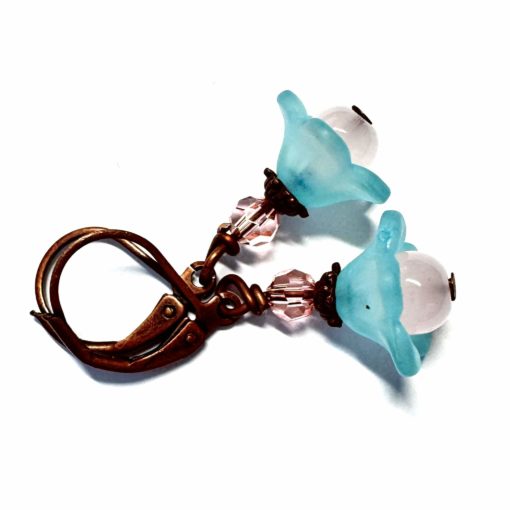 Verspielte kleine Blumen Ohrhänger mit rosa Perle und Hellblauer Blüte.