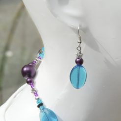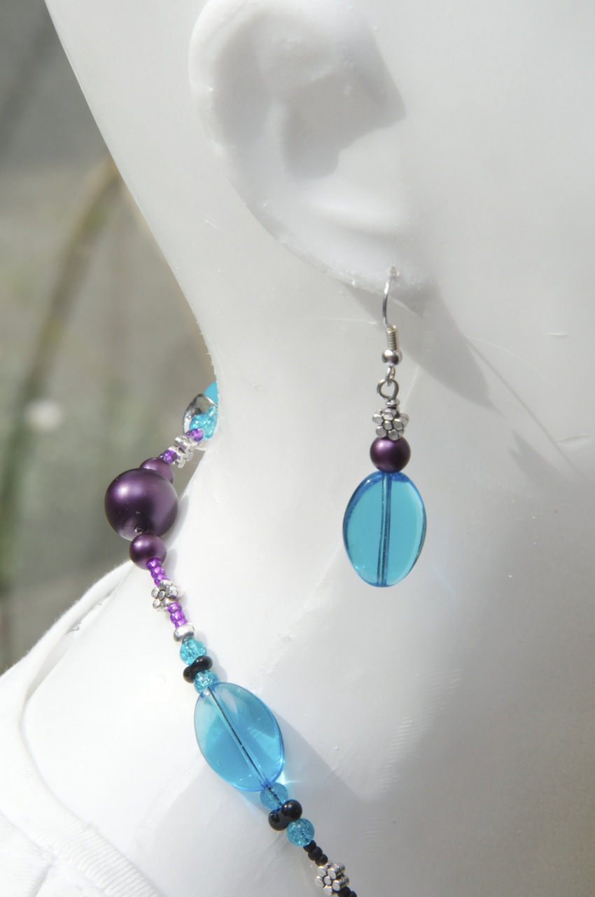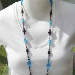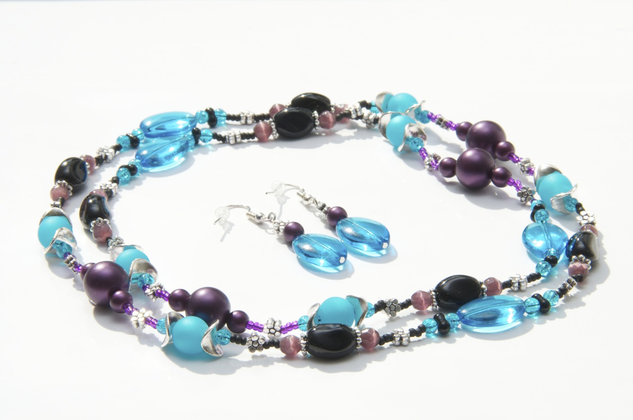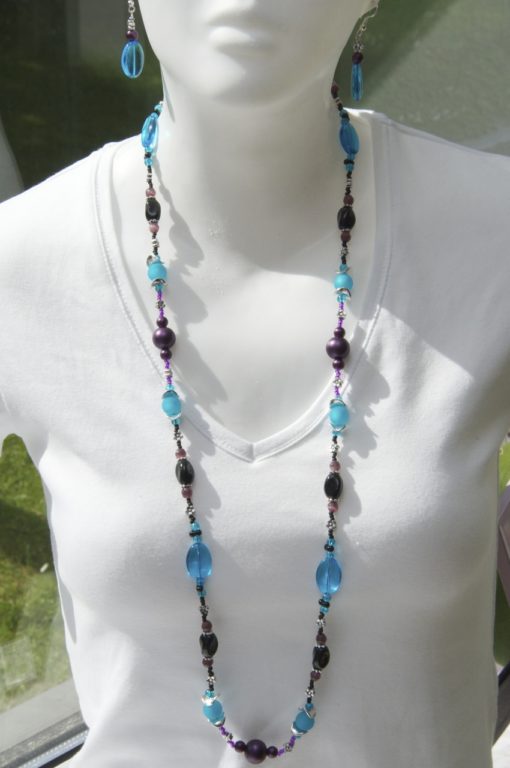 Eine wunderschöne lange Kette in den Farben Türkis, Violett und Schwarz. Hier habe ich mit verschiedenen Glasperlen und silbernen Elementen gearbeitet. Die Kette legt sich sehr angenehm um den Hals und passt so gut wie überall dazu. Jede Perlenkette im Shop ist ein Einzelstück und kommt mit den passenden Ohrringen.