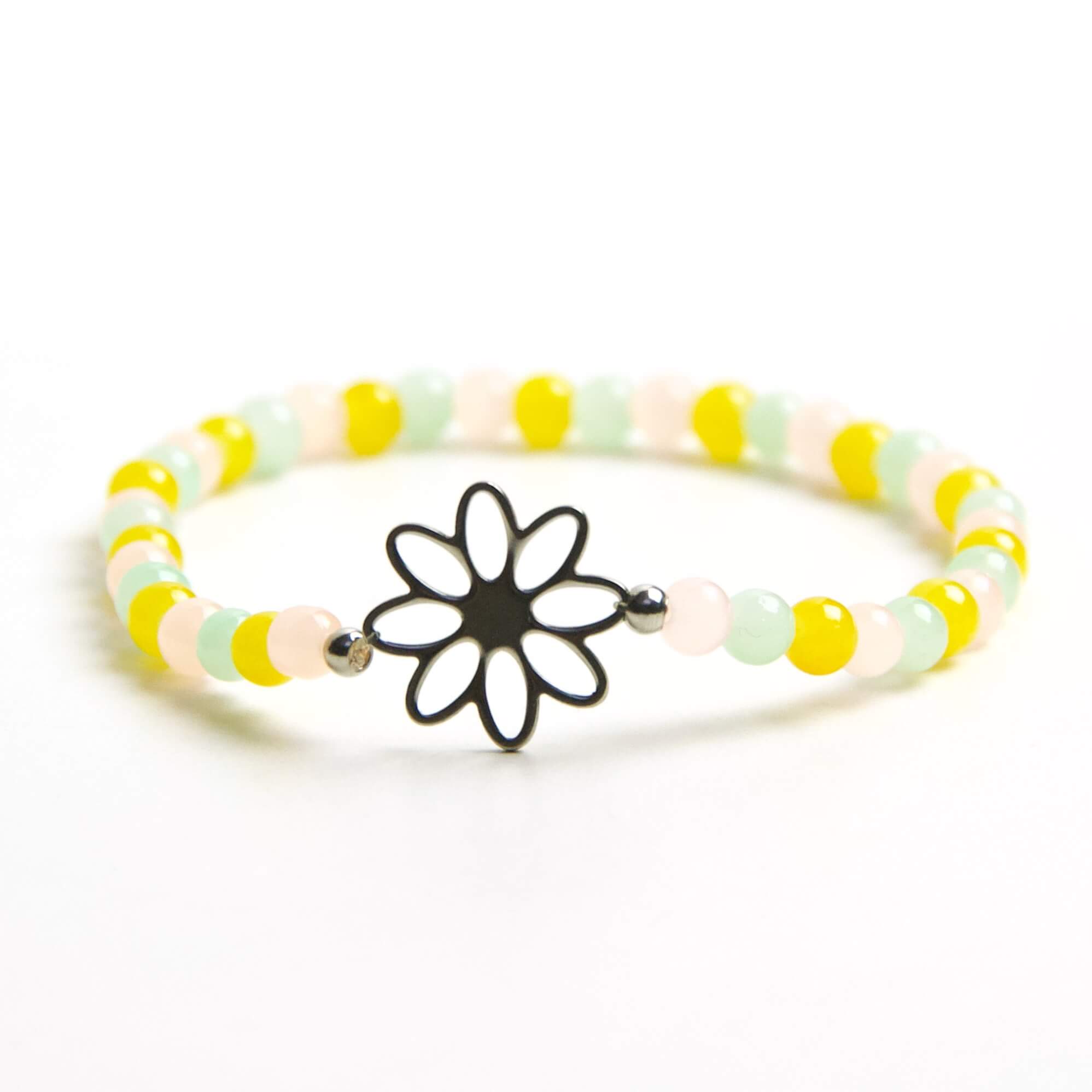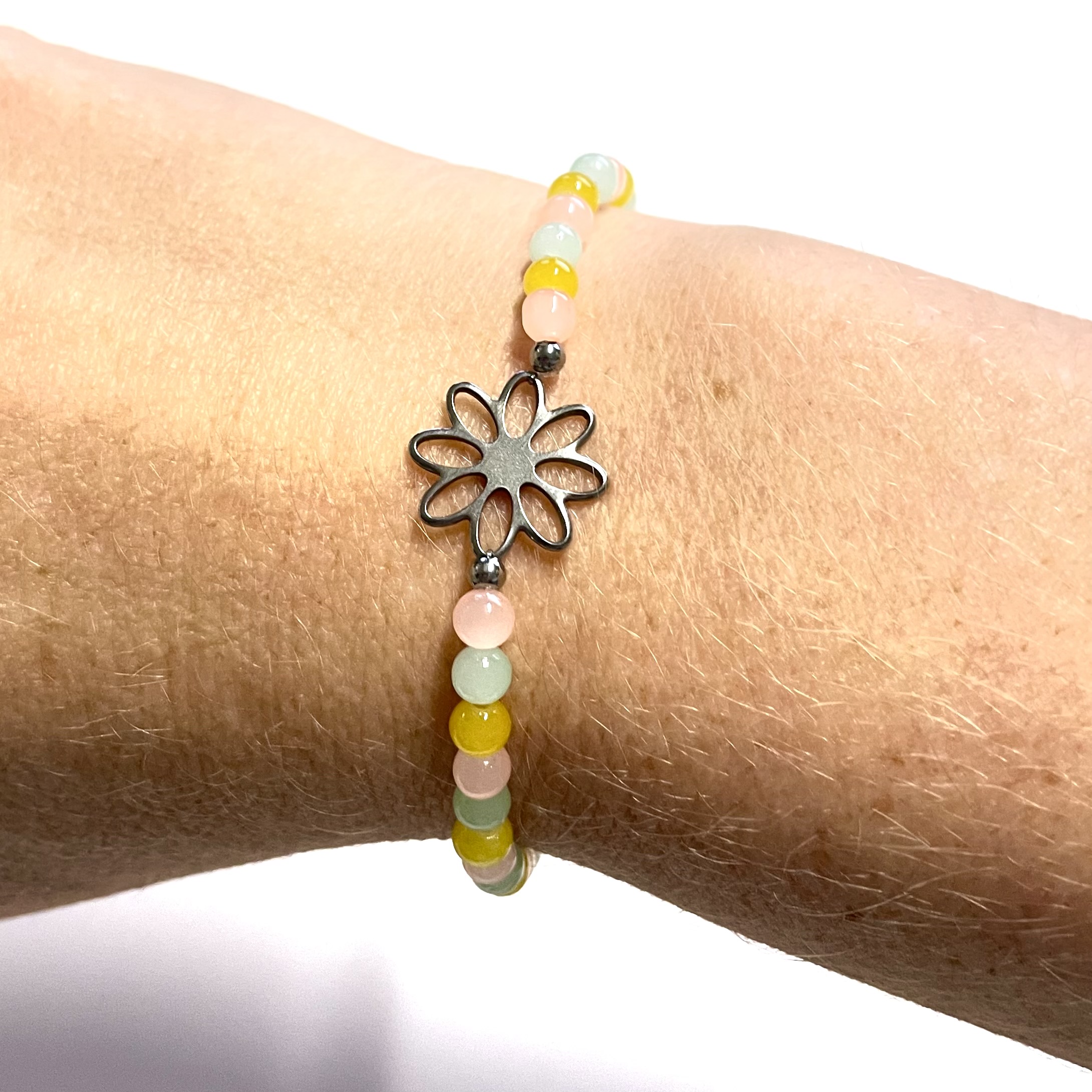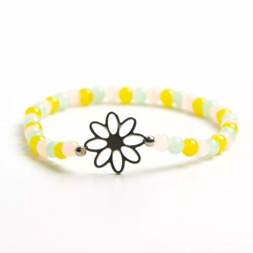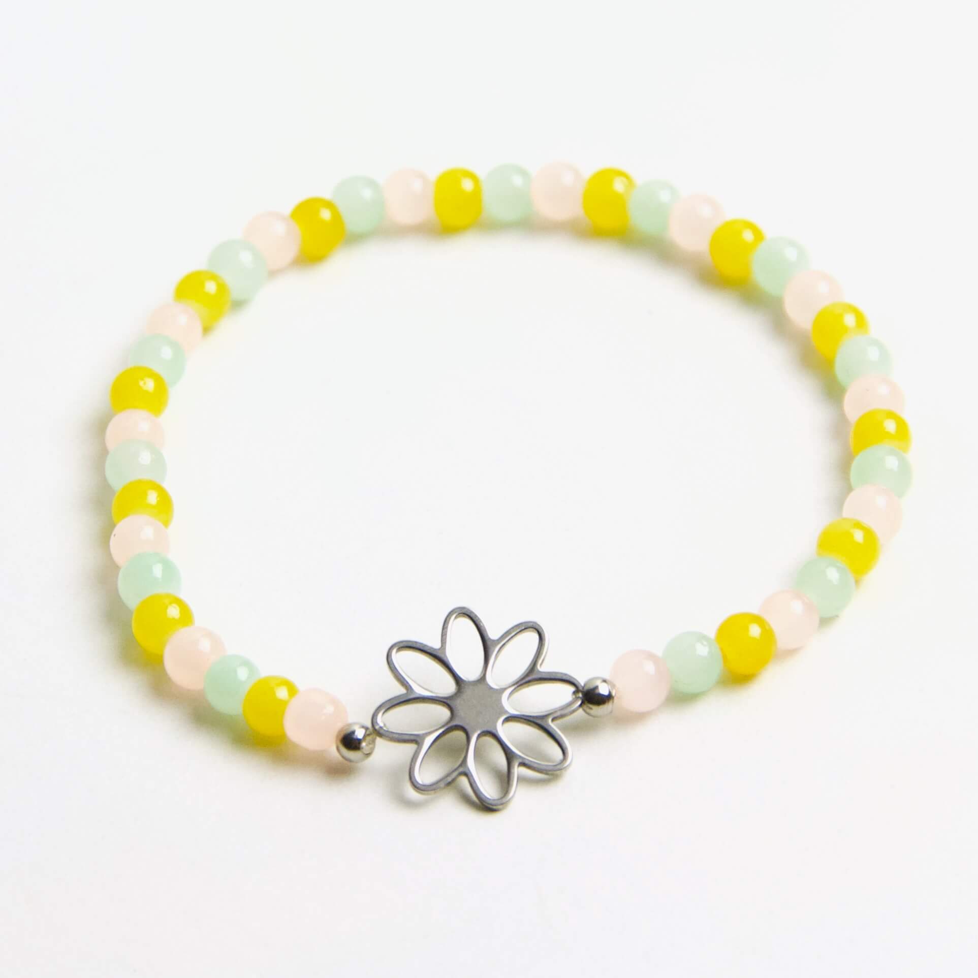 Zartes Armband mit Glasperlen in den Farben gelb, rosa und grün. Das Armband ist ein absoluter Hingucker und tolles Accessoires für dich.