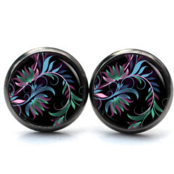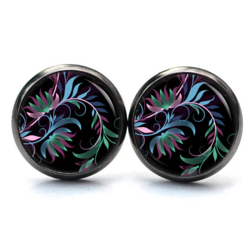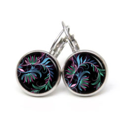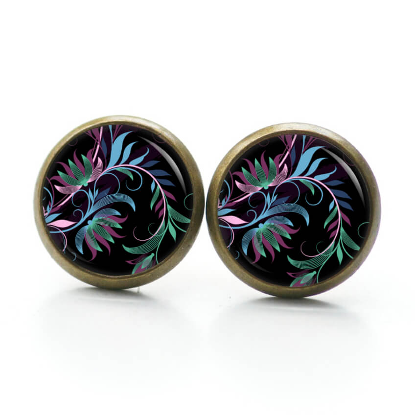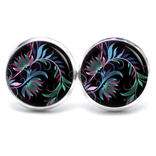 Druckknopf Ohrstecker Ohrhänger bunte Blätter in blau rosa grün auf schwarz