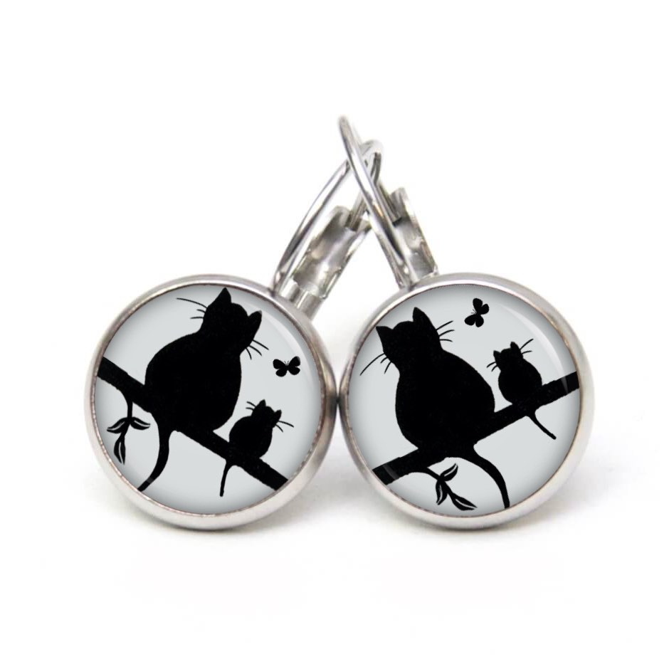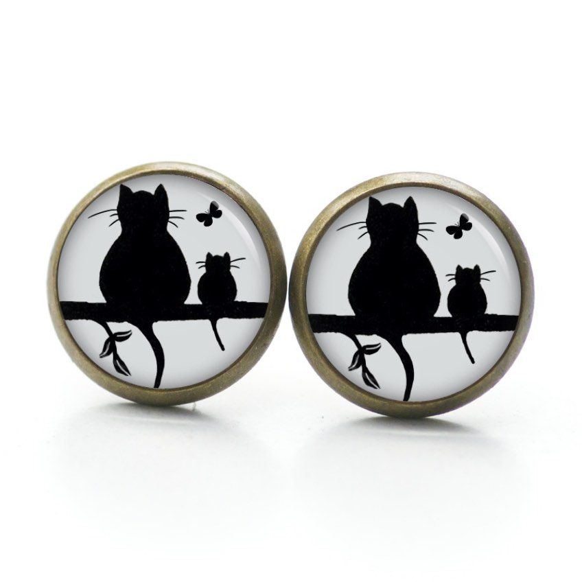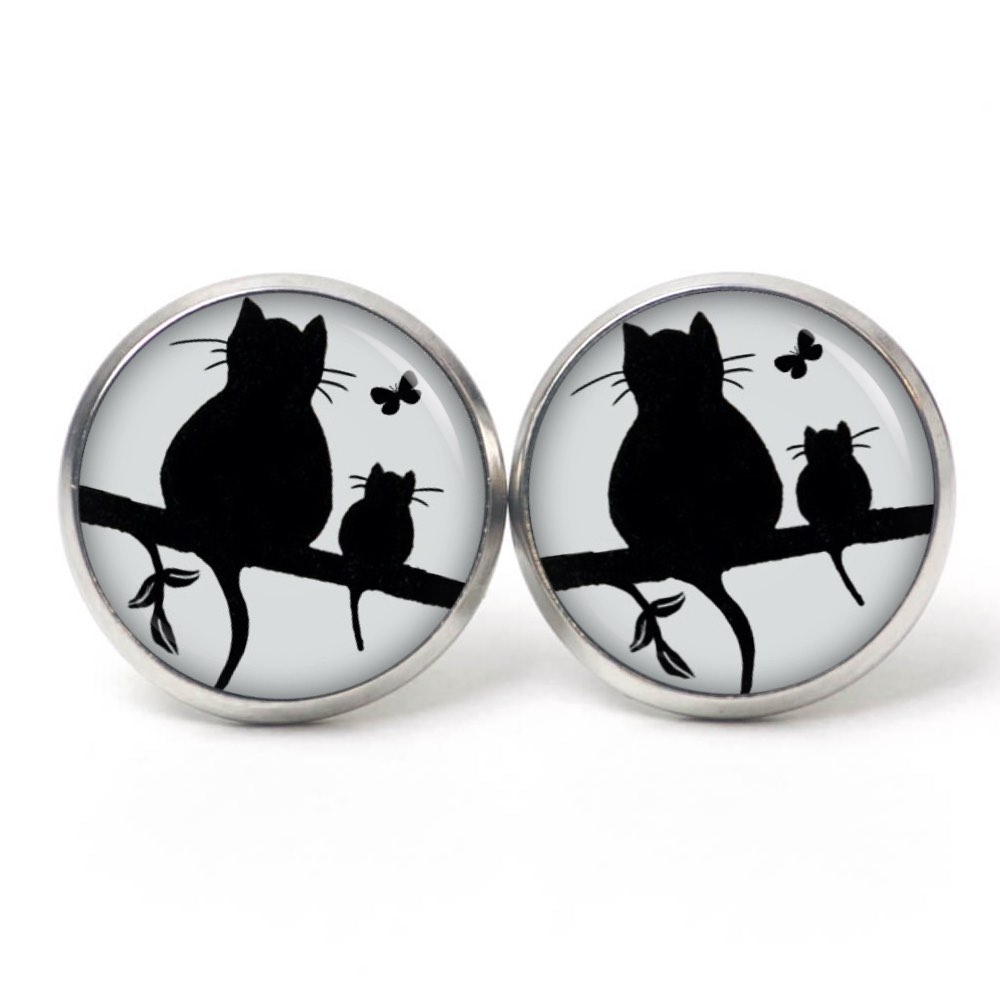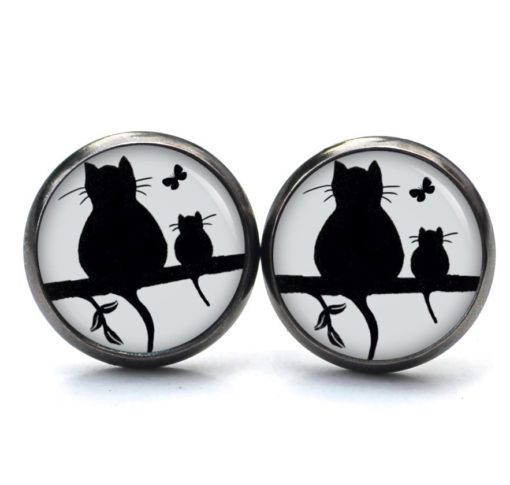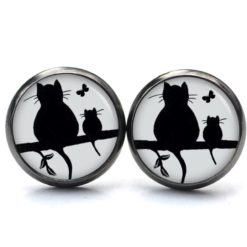 Druckknopf Ohrstecker Ohrhänger Clipse Katze und Babykatze mit Schmetterling in Grau
