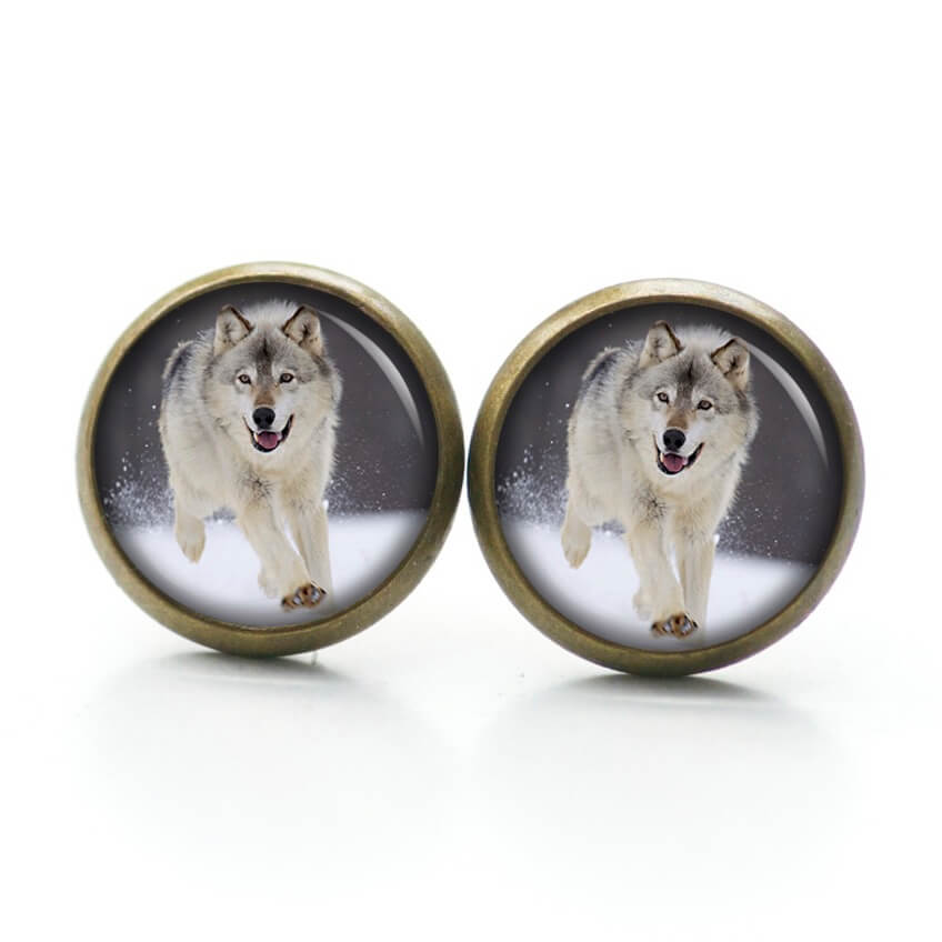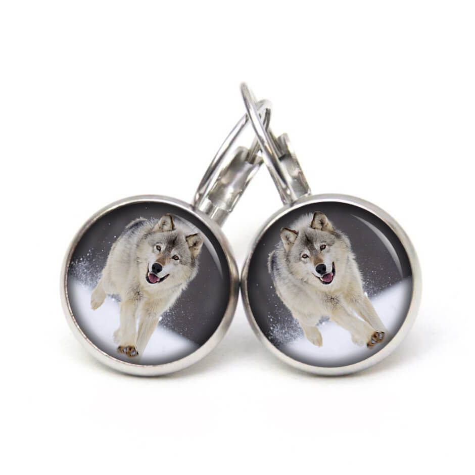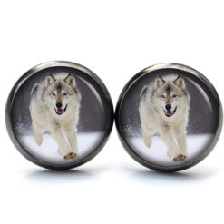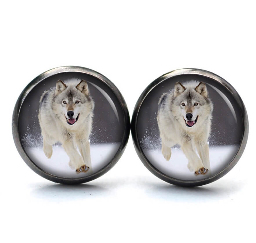 Ohrstecker, Ohrhänger, Clipse & Druckknopf – Motiv Wolf im Schnee – Schmuck aus Edelstahl