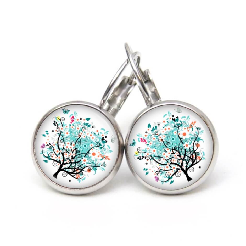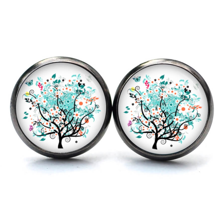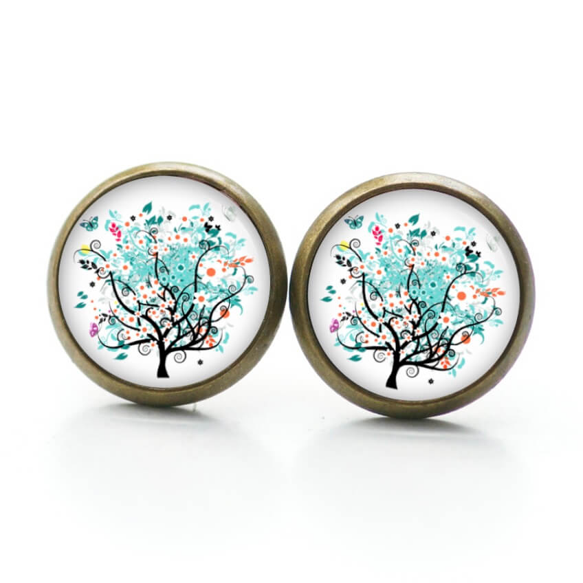 Druckknopf Ohrstecker Ohrhänger türkiser Baum mit Blumen und Schmetterling