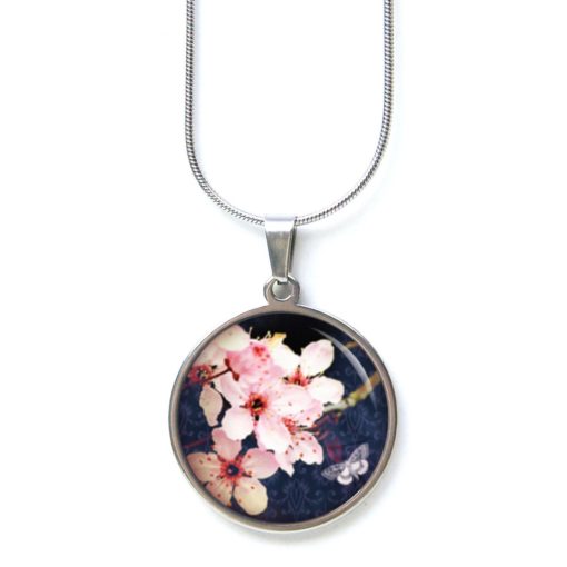 Edelstahl Kette rosa Orchideen mit dunkelblauem Hintergrund – verschiedene Längen