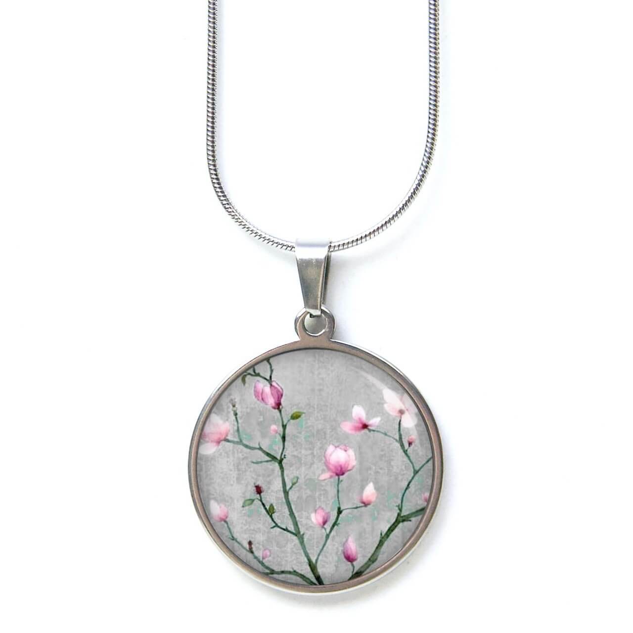 Edelstahl Kette zauberhafte Kirschblüten in grau und rosa