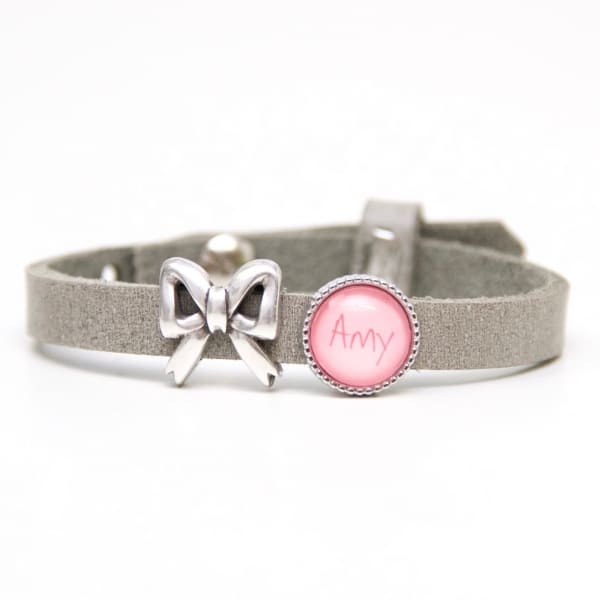 Lederarmband in grau mit 1 Wunsch Namen und einer Schleife – Farbwahl