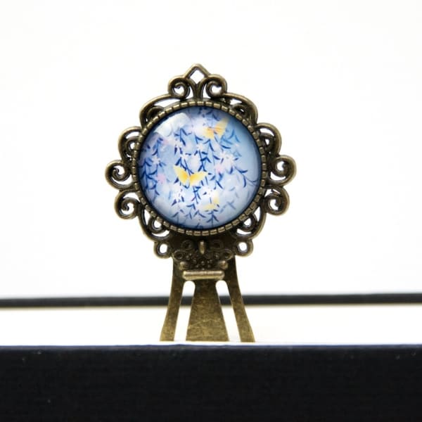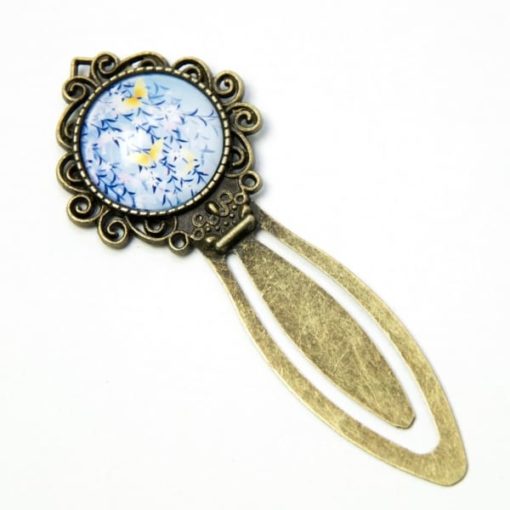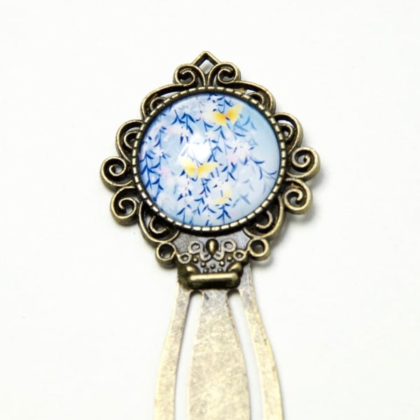 Tolle bronzene Lesezeichen Klammer mit einem blauen Blumen Motiv und zarten Zitronenfaltern.