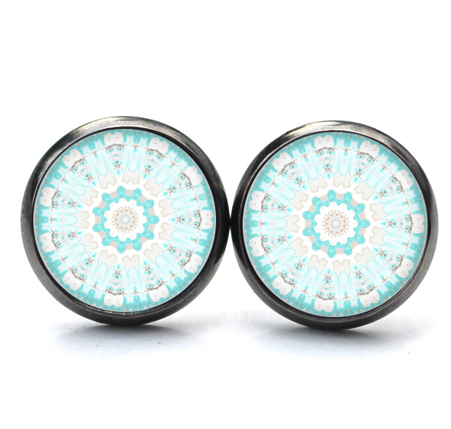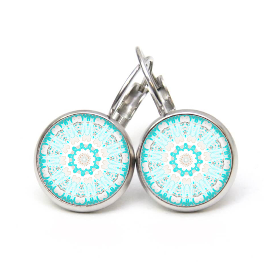 Ohrstecker, Ohrhänger, Clipse & Druckknopf – Motiv türkis weiß verspieltes Mandala Mosaik – Schmuck aus Edelstahl