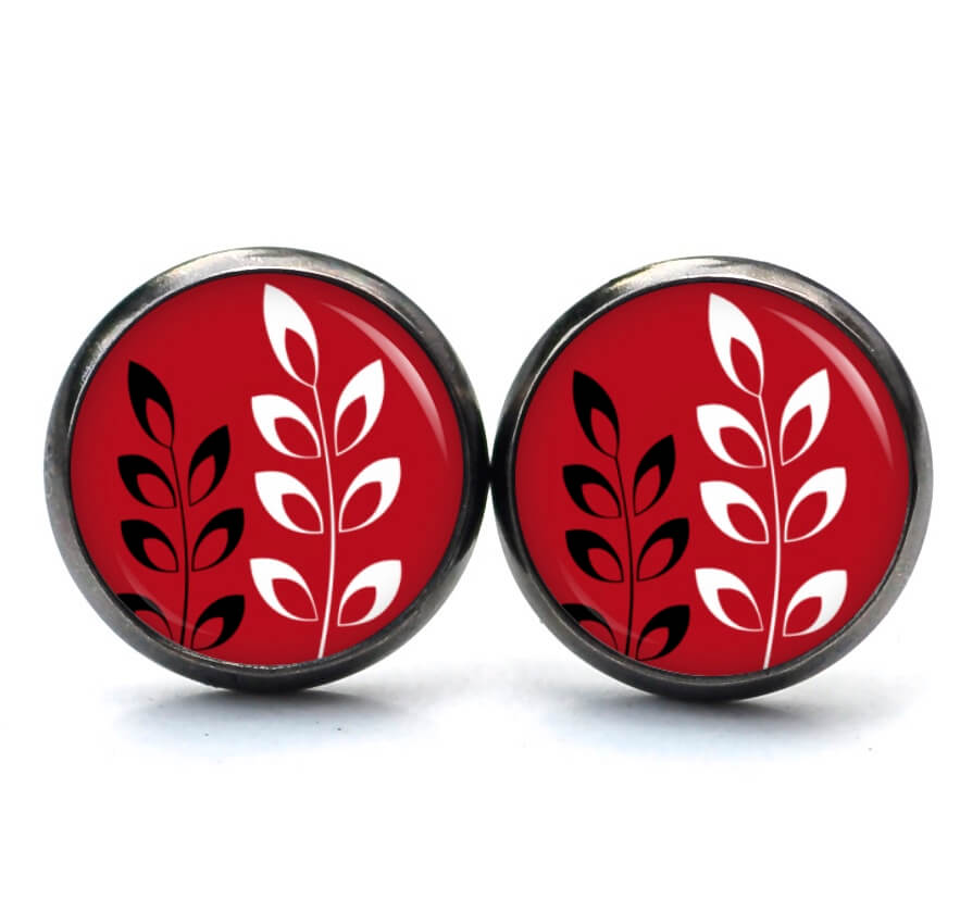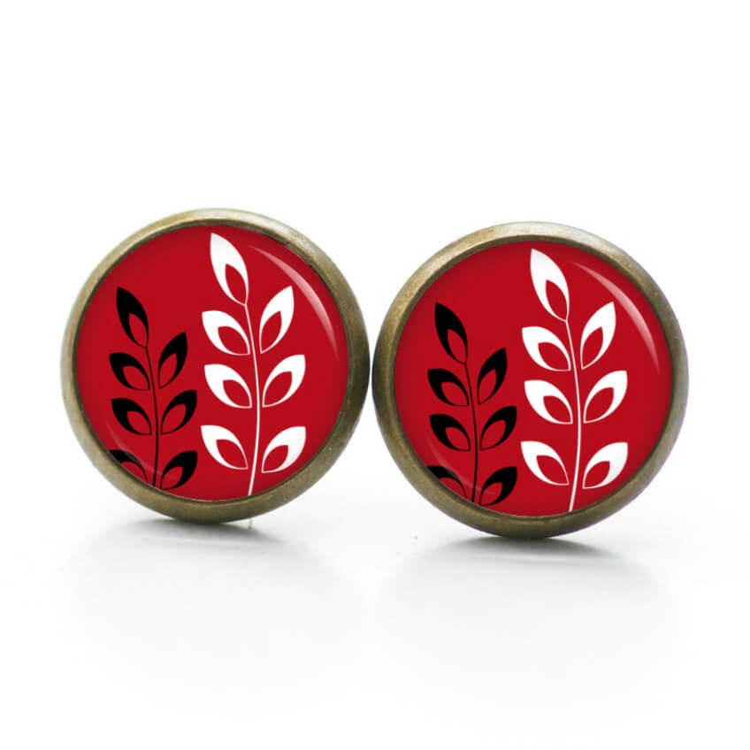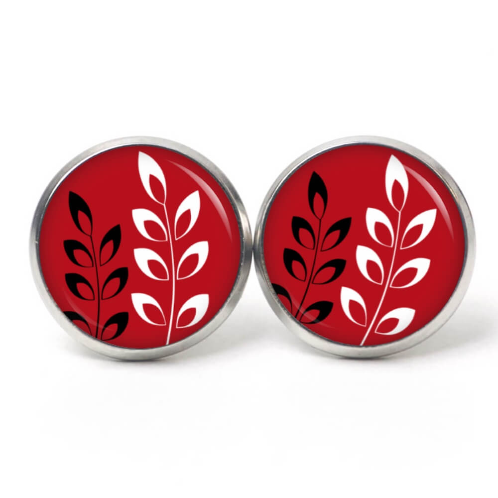 Ohrstecker, Ohrhänger, Clipse & Druckknopf – Motiv schwarz weiße Blätter auf Rot – Schmuck aus Edelstahl
