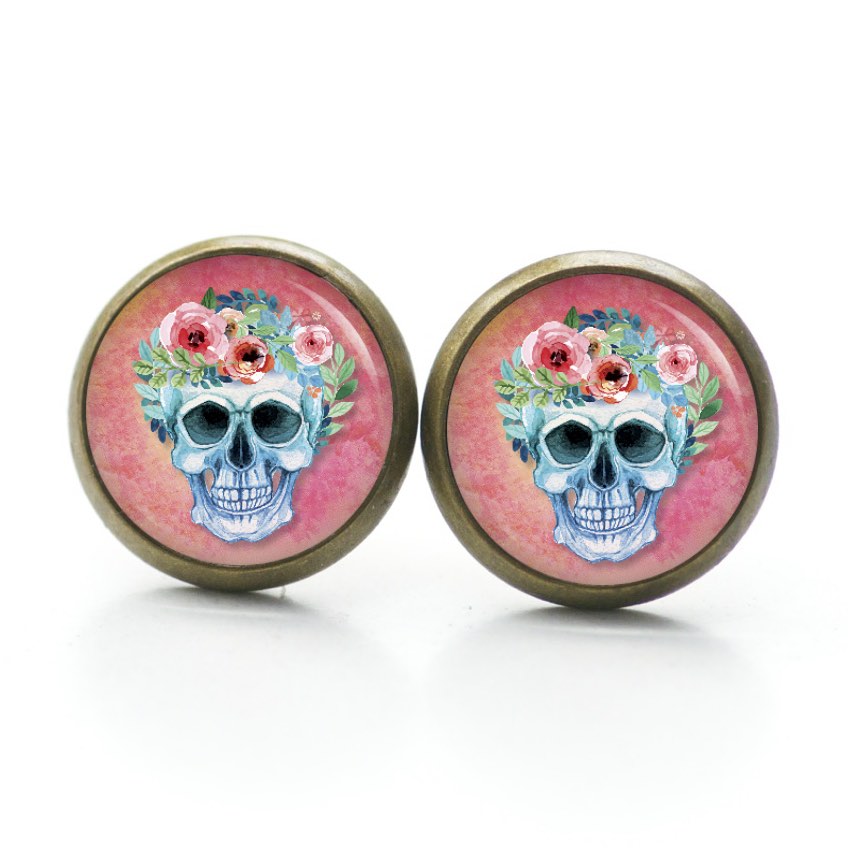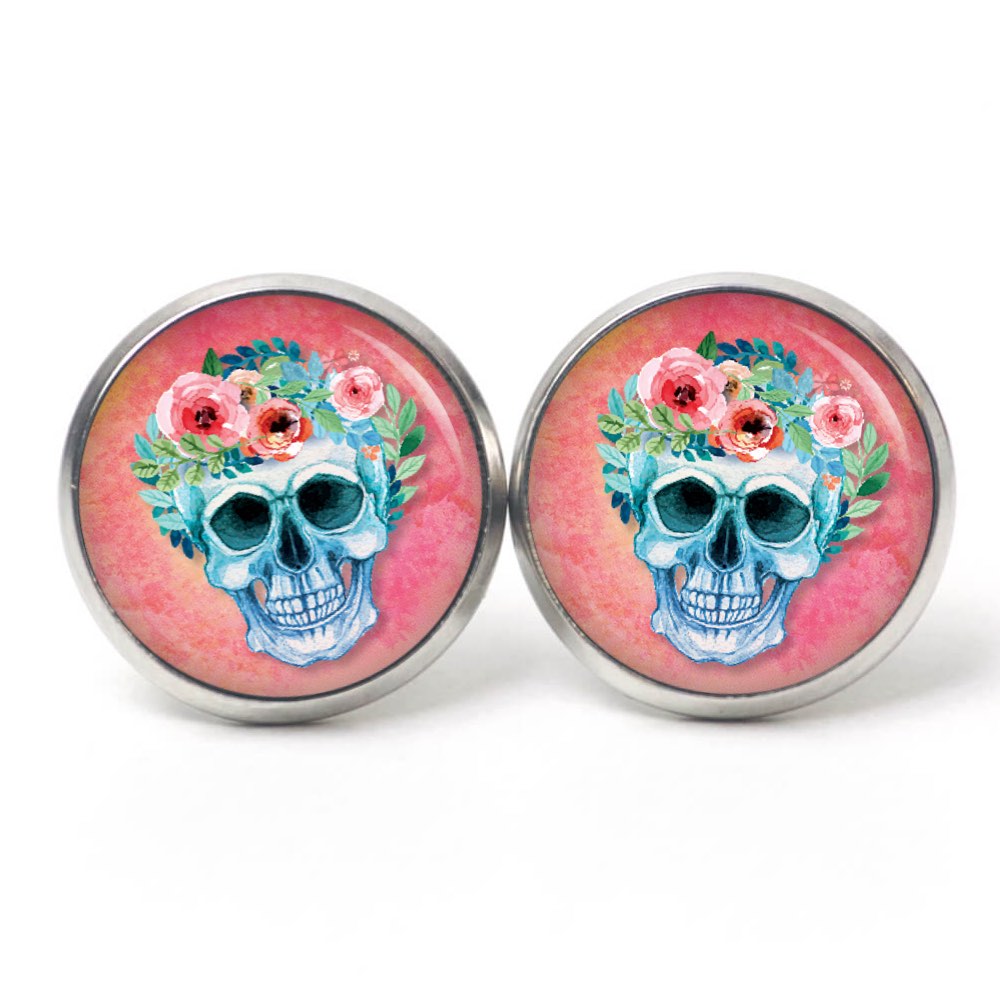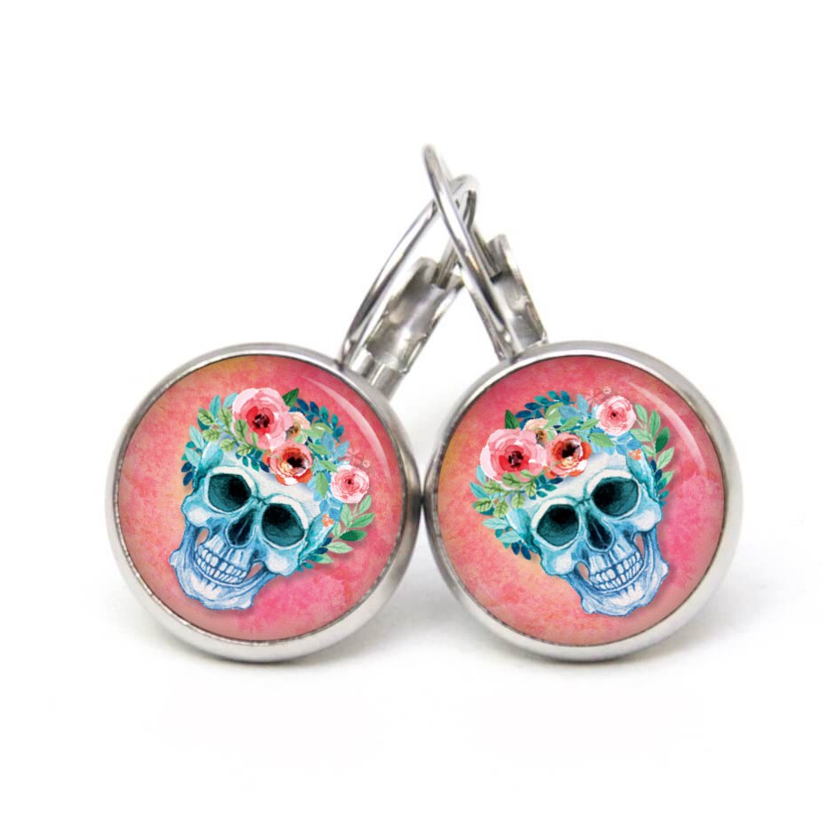 Ohrstecker, Ohrhänger, Clipse & Druckknopf – Motiv Totenkopf mit Blumen Frühling Rosarot – Schmuck aus Edelstahl