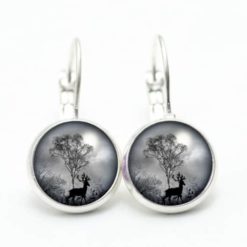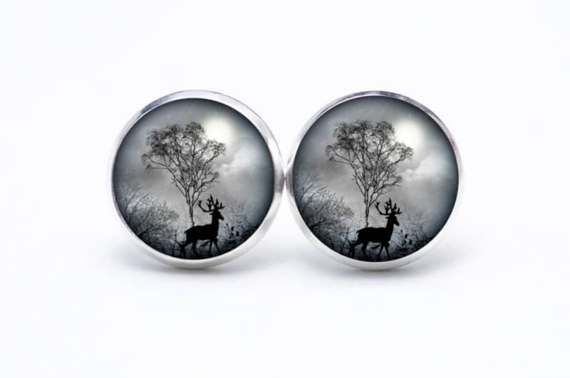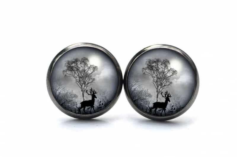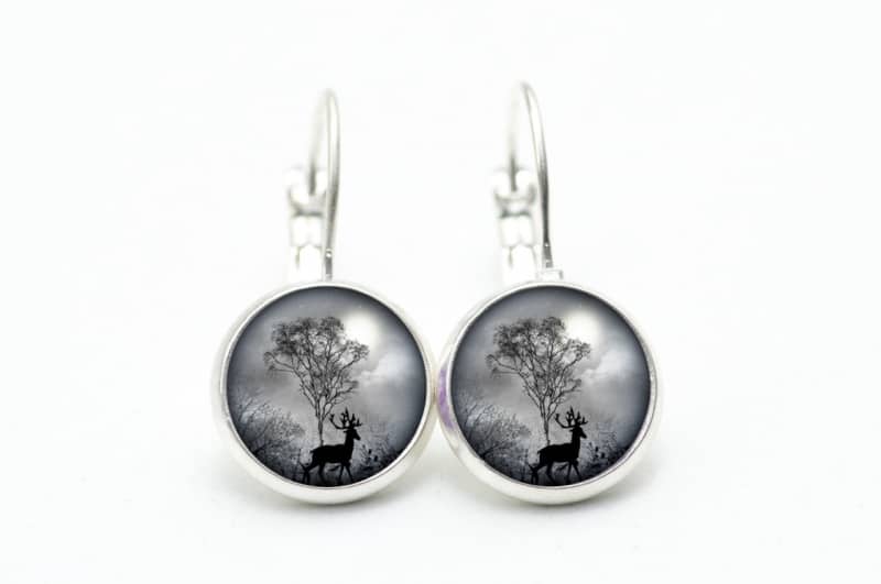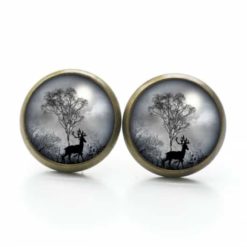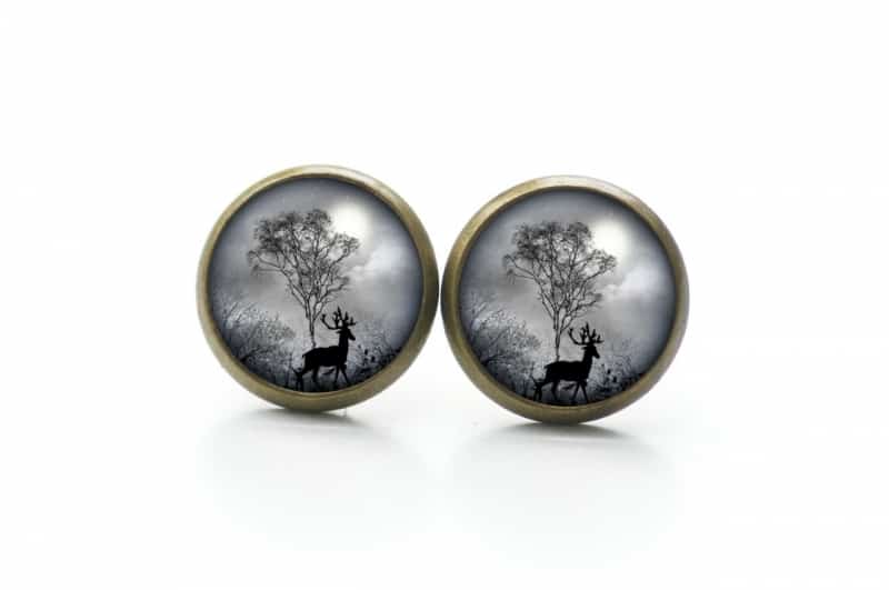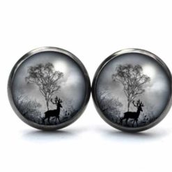 Druckknopf Ohrstecker Ohrhänger Hirsch im Wald grau schwarz