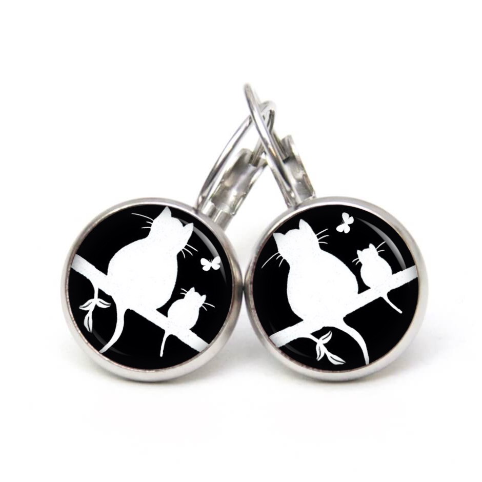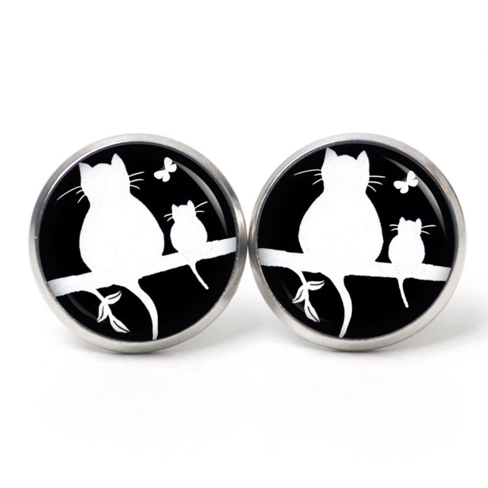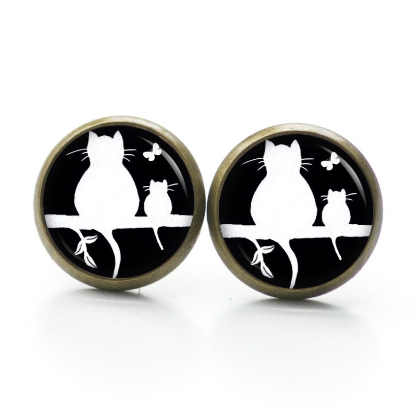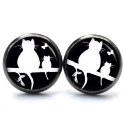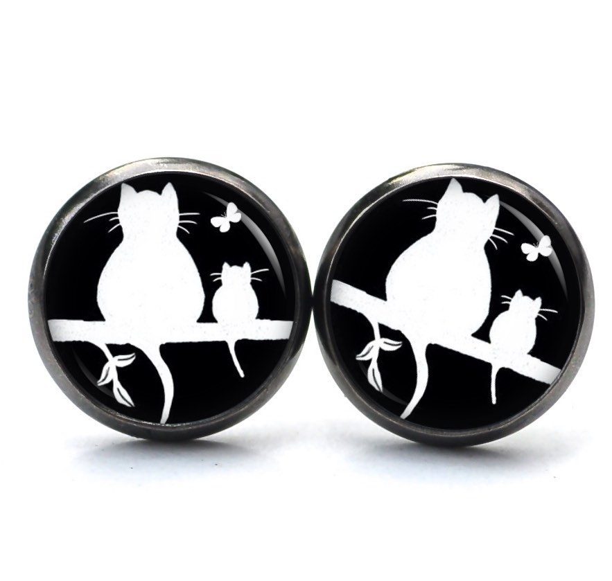 Druckknopf Ohrstecker Ohrhänger Clipse Katze und Babykatze mit Schmetterling in schwarz