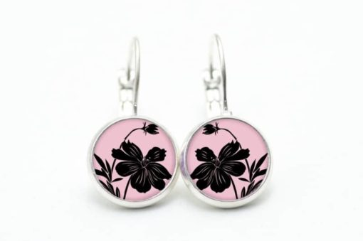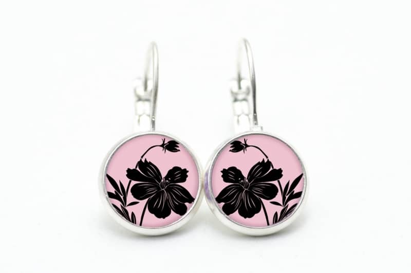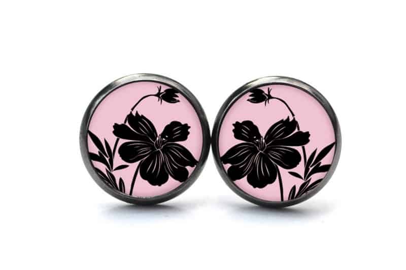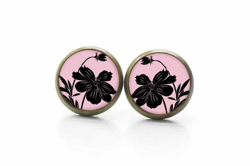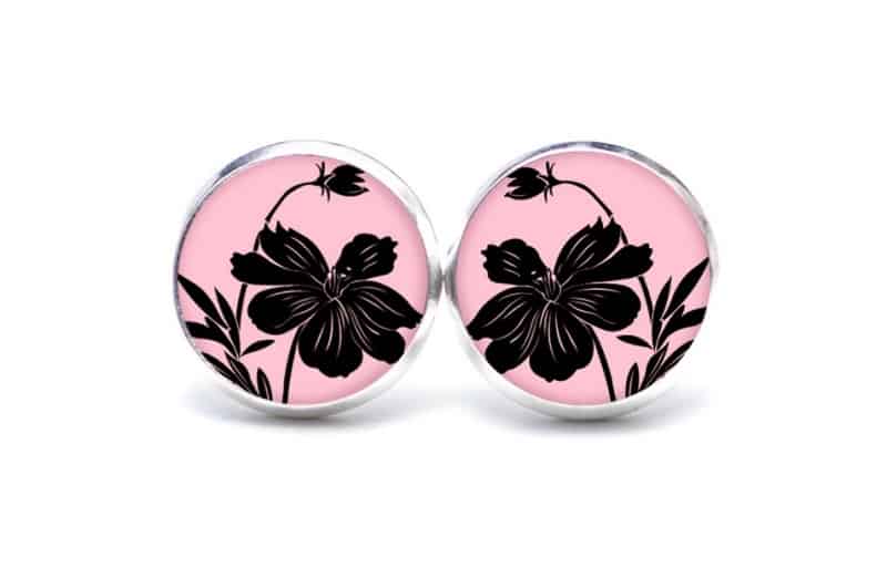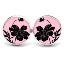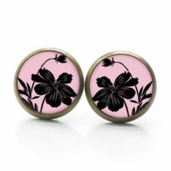 Druckknopf / Ohrstecker / Ohrhänger rosa mit schwarzen Blumen