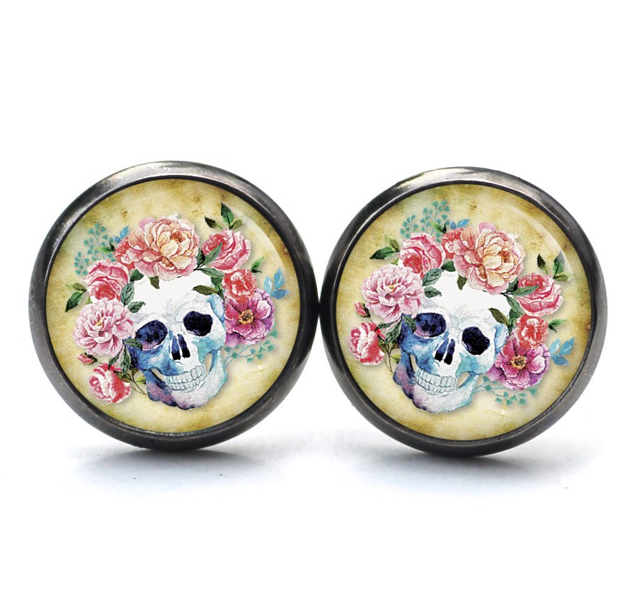 Ohrstecker, Ohrhänger, Clipse & Druckknopf – Motiv Totenkopf mit Blumen Frühling Gelb – Schmuck aus Edelstahl