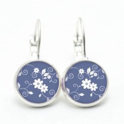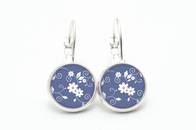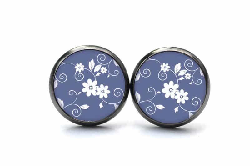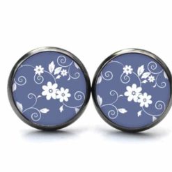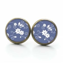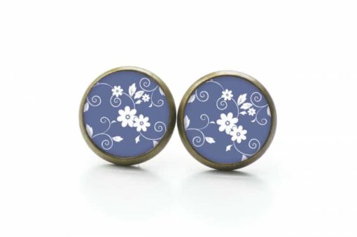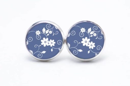 Druckknopf / Ohrstecker / Ohrhänger weiß Blumen auf blauem Hintergund