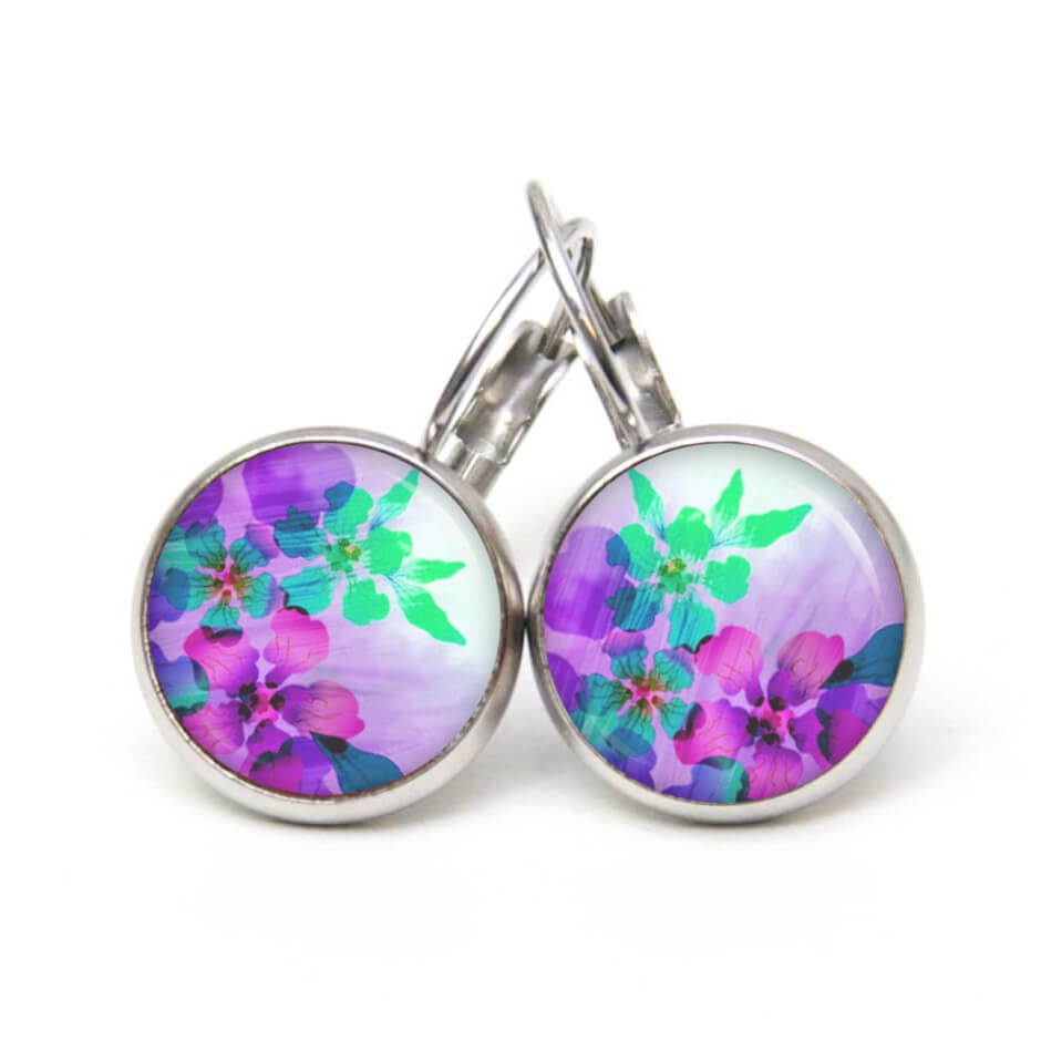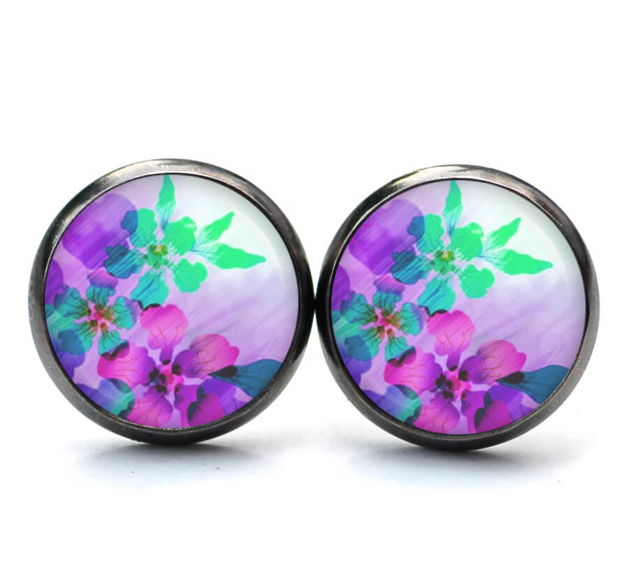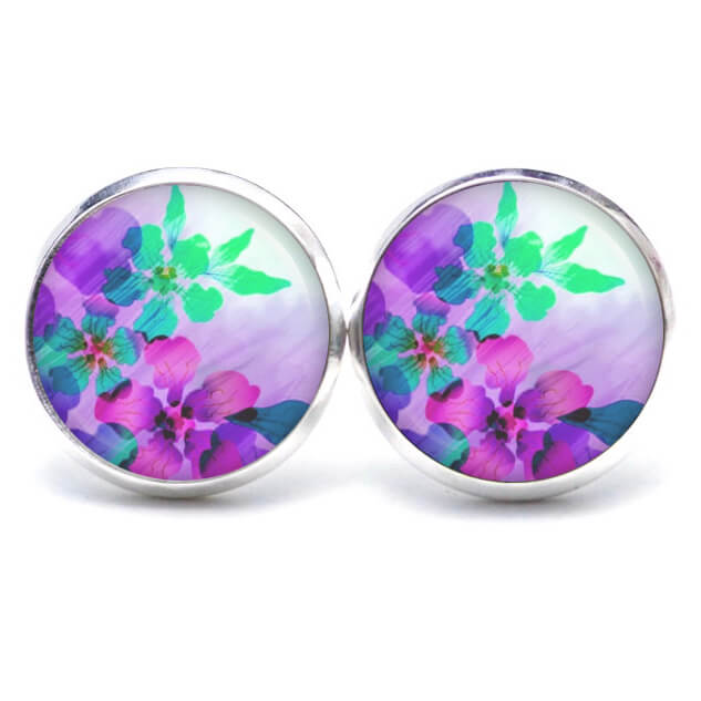 Druckknopf Ohrstecker Ohrhänger Clipse zarte Blumen in fuchsia und grün