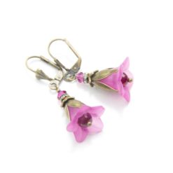 Wunderschöne Blumen Ohrringe in Bronze mit einer rosa Glockenblume und Glasschliffperlen verziert.