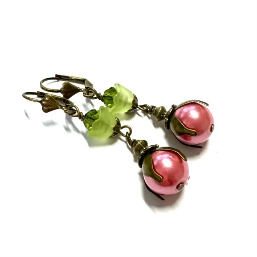 Wunderschöne Blumen Ohrringe in Bronze mit einer rosa Glockenblume und Glasschliffperlen verziert.