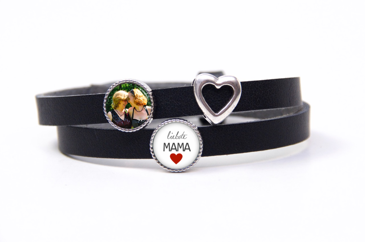 Das perfekte Geschenk für die beste Mama. Wunderschönes zweifach gewickeltes Lederarmband mit einer Fotoschiebeperle, einer Schiebeperle „Beste Mama“ und einer Herz Schiebeperle. Statt dem Text „Liebste Mama“ kann da natürlich auch jeder andere Text genommen werden, oder auch nur ein Name, ein Datum, was auch immer du gern da stehen haben möchtest.