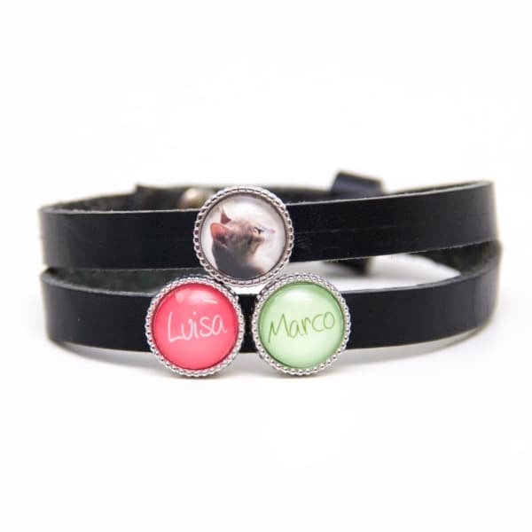 Schwarzes Lederarmband mit 2 Wunsch Namen und Foto – Farbwahl