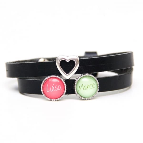 Schwarzes Lederarmband mit 2 Wunsch Namen und Herz – Farbwahl